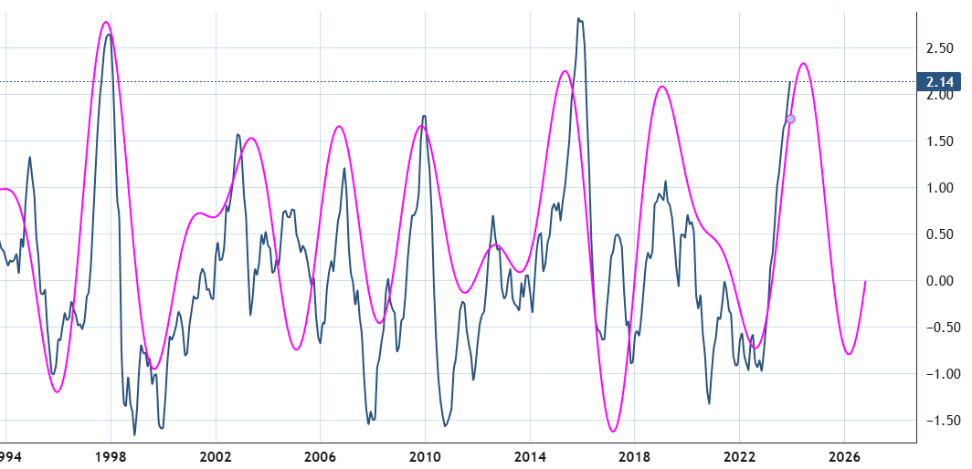 Based on the current phase of the three stable cycles, the forecast for 2024 showed a peak in sea surface temperature anomalies late 2023 or early in 2024, followed by a decline back to more normal levels into 2025. With an upcoming low early 2026.