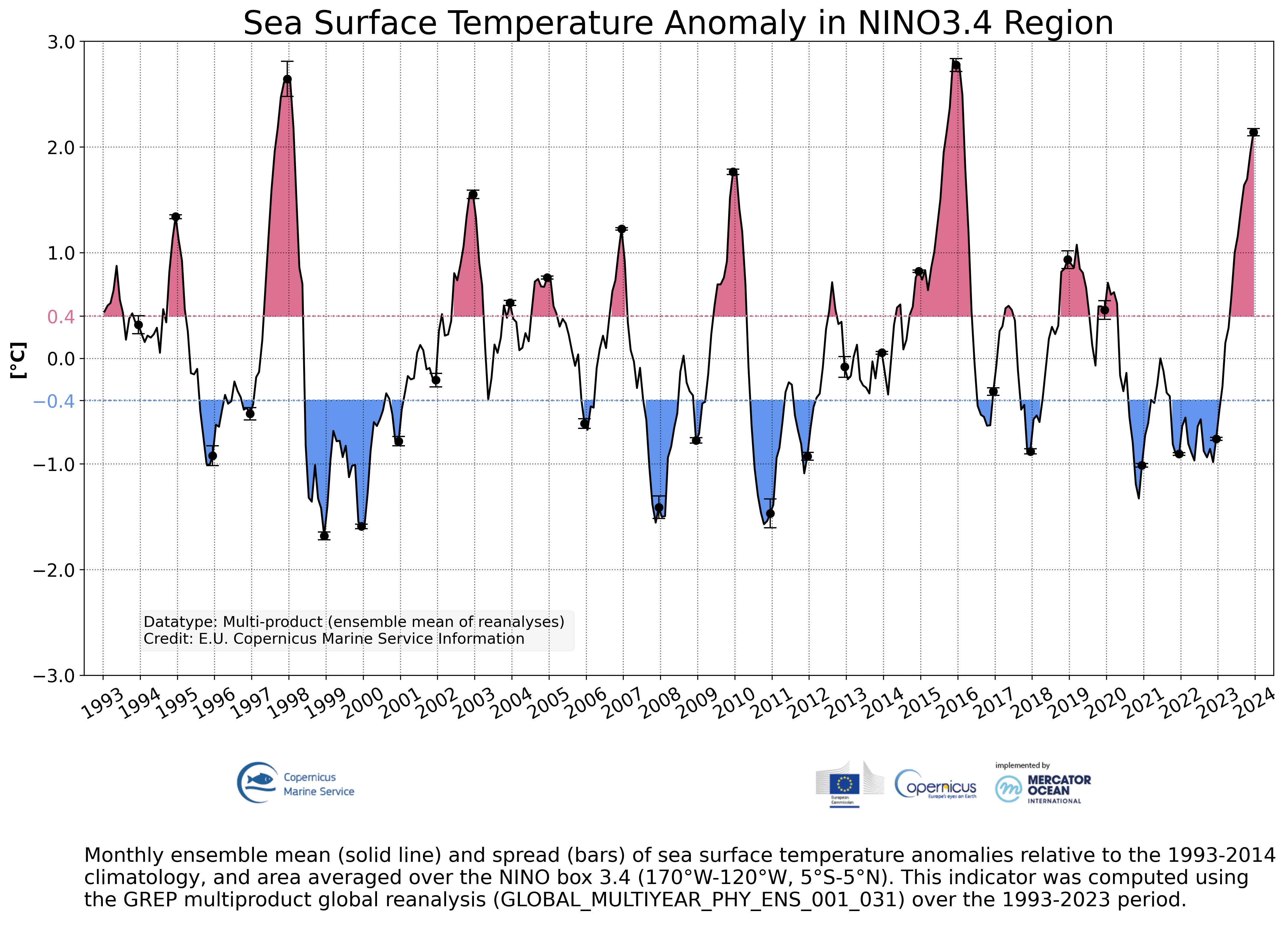 Nino 3.4 Sea Surface Temperature time series, Source: https://data.marine.copernicus.eu/product/GLOBAL_OMI_CLIMVAR_enso_sst_area_averaged_anomalies/description